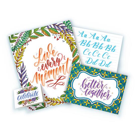 Follow 15 instruction pages to learn and practice calligraphy techniques. This all-in-one lettering activity kit includes 15 Instruction Pages 3 Frameable Art Pages 12 Dual Tip Markers 2 Gel Pens 1 Photo Frame 4 Place Cards and 8 Gift tags. Learn More Every child is an artist.