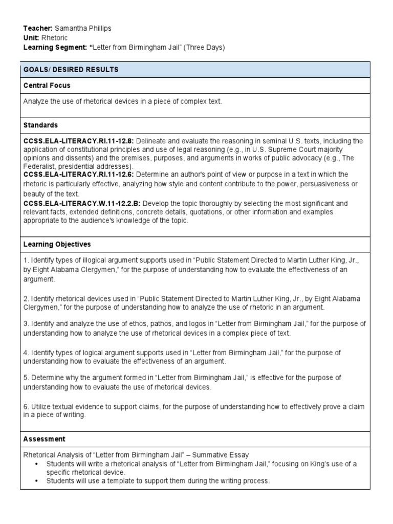 Sample Plan Letter From Birmingham Jail Rhetoric Logos